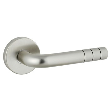 Deurkruk. Type Futura mat vernikkeld (RVS look), op rond rozet. De deurklink is vast gemonteerd op het rozet en is voorzien van een veer waardoor de kruk niet gaat hangen. Sleutel- en cilinderplaatje en WC garnituur en blind schild, sleutel 56mm en WC 63/8 beschikbaar. Het is mogelijk om in de bouwmarkt afwijkende WC, sleutel en cilindermaten te bestellen.