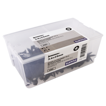 Deze gipsplaatschroef van GAMMA is speciaal gemaakt voor het schroeven in gipsplaten. De schroef heeft draad over de volle lengte en biedt daarmee veel grip in de materie. De zwarte metalen schroeven hebben een afmeting van 3,6 bij 25mm en zijn voorzien van een PH-schroefkop en een Philips-aandrijving. U kunt de schroeven dus indraaien met een kruiskopschroevendraaier. Deze schroeven zijn gefosfateerd, wat zorgt voor een goede hechting van stuc en pleisterwerk. Omdat de kop platverzonken is, zijn de ingedraaide schroeven niet meer zichtbaar. Eén verpakking bevat 200 stuks.