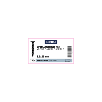 De GAMMA-gipsplaatschroef 3,6x25mm is verpakt in een handige box met 750 stuks. Dankzij het voldraad van de gipsplaatschroeven is het monteren van gipsplaten op hout eenvoudig. Daarnaast is het draad fijn genoeg om ook gipsplaten op aluminium te monteren. De 750 gipsplaatschroeven hebben een Phillips-schroefkop die u aandraait met een kruiskopschroevendraaier. De schroeven voor gipsplaten hebben een dikte van 3,6mm en een lengte van 25mm. De gipsplaatschroeven koopt u per 750 stuks.