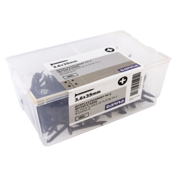 Deze gipsplaatschroef van GAMMA is speciaal gemaakt voor het schroeven in gipsplaten. De schroef heeft draad over de volle lengte en biedt daarmee veel grip in de materie. De zwarte metalen schroeven hebben een afmeting van 3,6 bij 35mm en zijn voorzien van een PH-schroefkop en een Philips-aandrijving. U kunt de schroeven dus indraaien met een kruiskopschroevendraaier. Deze schroeven zijn gefosfateerd, wat zorgt voor een goede hechting van stuc en pleisterwerk. Omdat de kop platverzonken is, zijn de ingedraaide schroeven niet meer zichtbaar. Eén verpakking bevat 150 stuks.
