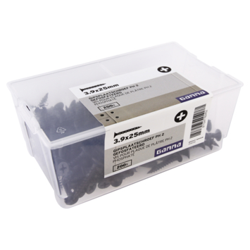 Deze gipsplaatschroef van GAMMA is speciaal gemaakt voor het schroeven in gipsplaten. De schroef heeft draad over de volle lengte en biedt daarmee veel grip in de materie. De zwarte metalen schroeven hebben een afmeting van 3,9 bij 25mm en zijn voorzien van een PH-schroefkop en een Philips-aandrijving. U kunt de schroeven dus indraaien met een kruiskopschroevendraaier. Deze schroeven zijn gefosfateerd, wat zorgt voor een goede hechting van stuc en pleisterwerk. Omdat de kop platverzonken is, zijn de ingedraaide schroeven niet meer zichtbaar. Eén verpakking bevat 200 stuks.