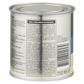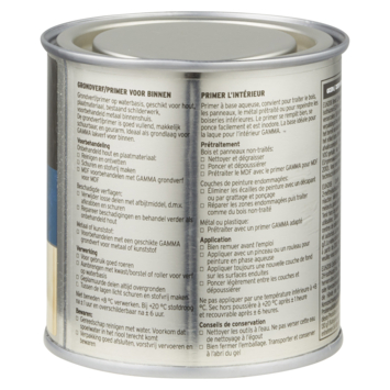 De GAMMA grondverf 250 ml wit is een prima basis voor goed schilderwerk binnenshuis. Je beschermt het houtwerk, plaatmateriaal, bestaand schilderwerk en voorbehandeld metaal binnenshuis optimaal door de ondergrond voor te behandelen met deze grondverf. Door het gebruik van GAMMA grondverf op waterbasis hecht de afwerklaag beter en je krijgt een mooier eindresultaat met een goede en egale dekking. Het is een watergedragen verf, makkelijk schuurbaar en geurarm en daardoor de ideale grondverf voor al het houtwerk binnenshuis. Het blik heeft een inhoud van 250 milliliter dit is voldoende voor een oppervlakte van ongeveer 3 m². De grondverf is na 1 uur stofdroog en na 6 uur overschilderbaar. De verf kan je het beste verwerken bij een temperatuur tussen de 8 en 25°C. Werk het liefst bij daglicht om geen stukjes oppervlak te missen. Schilder hout altijd in de richting van de houtnerf. De grondverf is eenvoudig aan te brengen met een kwast of lakroller voor verf op waterbasis. Deze koop je bij de dichtstbijzijnde GAMMA of via de webshop.