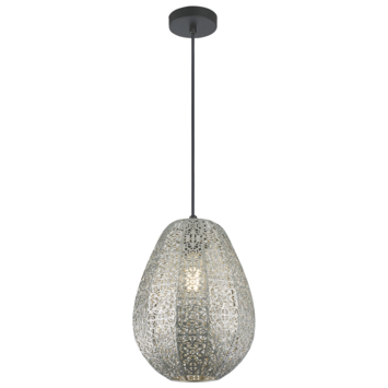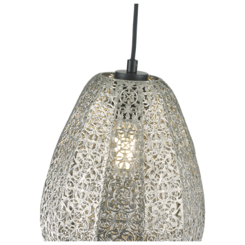 De hanglamp Aisha is exclusief voor de E27 lichtbron. Door de opengewerkte motieven in de metalen lamp ontstaan er mooie lichteffecten op de muur. De hanglamp is gemaakt van metaal en heeft een zilverkleurige uitstraling. De hanglamp kan gemakkelijk aan het plafond worden gemonteerd en is in hoogte verstelbaar. De lampenkap heeft een diameter van 22.5 cm.