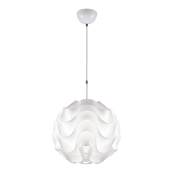 De hanglamp Carice is exclusief voor de E27 lichtbron. De hanglamp is gemaakt van wit, kunststof. Het design van de hanglamp is vrij uniek. Waardoor de lamp een goede toevoeging is aan de ruimte. De hanglamp is geschikt voor LED verlichting. De lampenkap heeft een diameter van 32 cm. En kan je in hoogte verstellen tot 80 cm.