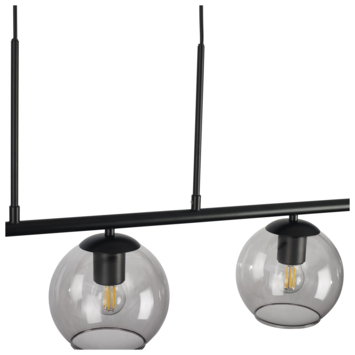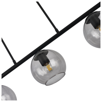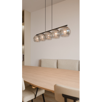 De hanglamp met 5 lichtpunten van GAMMA is ontworpen voor gebruik met E27 lampen. De lamp is vervaardigd uit stevig zwart metaal en de vijf lampenkappen zijn vervaardigd uit rookglas. Met afmetingen van 130cm in hoogte, 130cm in breedte en een diameter van 16 cm, voegt deze lamp stijlvolle elegantie toe aan elke ruimte. De lampenkappen zijn aan de onderkant open, waardoor het licht mooi naar beneden schijnt. Het snoer van de lamp kan indien gewenst worden aangepast in hoogte.