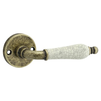Deurkruk. Type Hasselt antiek brons, op rond rozet. De deurklink is vast gemonteerd op het rozet en is voorzien van een veer waardoor de kruk niet gaat hangen. Sleutel- en cilinderplaatje en WC garnituur en blind schild, sleutel 56mm en WC 63/8 beschikbaar. Het is mogelijk om in de bouwmarkt afwijkende WC, sleutel en cilindermaten te bestellen.