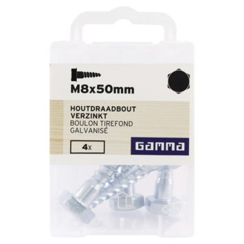 Deze houtdraadbout van GAMMA is gemaakt van verzinkt staal en heeft een zeskantkop en grof draad. De metrische maat van de bout is M8 en de lengte is 50mm. Deze bouten zijn erg geschikt voor het monteren van zware objecten aan betonnen muren in combinatie met de juiste plug. Ook kunt u deze bout bijvoorbeeld gebruiken om buitenlampen en vlagstokhouders vast te maken in bakstenen. In combinatie met de juiste plug zorgt deze bout voor een muurvaste verbinding. Eén verpakking bevat 4 stuks houtdraadbouten.