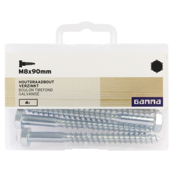Deze houtdraadbout van GAMMA is gemaakt van verzinkt staal en heeft een zeskantkop en grof draad. De metrische maat van de bout is M8 en de lengte is 90mm. Deze bouten zijn erg geschikt voor het monteren van zware objecten aan betonnen muren in combinatie met de juiste plug. Ook kunt u deze bout bijvoorbeeld gebruiken om buitenlampen en vlagstokhouders vast te maken in bakstenen. In combinatie met de juiste plug zorgt deze bout voor een muurvaste verbinding. Eén verpakking bevat 4 stuks houtdraadbouten.