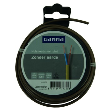 Met het Gamma huishoudsnoer plat zonder aarde (2x0,75 mm²) sluit u verlichtingsarmaturen en lichte huishoudelijke apparaten zonder aarde aan. Met een aderdikte van 0,75 mm² is dit huishoudsnoer geschikt voor aansluitingen binnenshuis tot maximaal 1380 Watt. Lengte: 7,5 meter. Kleur: brons. Bestaat uit twee aders (blauw - bruin).