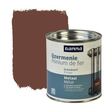 GAMMA ijzermenie roodbruin 750 ml op terpentinebasis is ideaal voor het beschermen van ijzer en staal dat na afwerking slecht bereikbaar wordt of als grondlaag voor metalen die verwarmd worden zoals radiatoren en verwarmingsbuizen. Ook heeft de ijzermenie een roestwerende werking. Eén blik van 750 ml volstaat voor het schilderen van een oppervlakte van 9 m2.