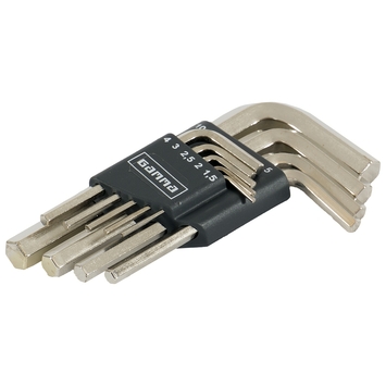 Deze GAMMA-inbussleutelset met clip bestaat uit 9 inbussleutels van 1,5mm tot 10mm. De inbussleutels, oftewel stiftsleutels, hebben de volgende sleutelmaten: 1,5mm, 2mm, 2,5mm, 3mm, 4mm, 5mm, 6mm, 8mm en 10mm. De zeskantige inbussleutels die geschikt zijn voor binnenzeskantschroeven zijn gemaakt van hoogwaardig chroom-molybdeen-vanadiumstaal. De set inbussleutels van 1,5mm tot 10mm bergt u op in de handige clip. Hierdoor kunt u de set stiftsleutels makkelijk meenemen en heeft u alle 9 maten inbussleutels van 1,5mm tot 10mm direct beschikbaar. Met de set inbussleutels draait u inbusschroeven met afmetingen van 1,5mm tot 10mm los of vast. Bent u op zoek naar andere maten inbussleutels? GAMMA’s assortiment biedt ook nog andere stiftsleutelsets of inbussleutelsets.