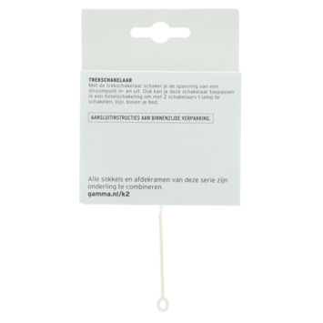 Met de GAMMA K2 Trekschakelaar Wit kun je heel handig een lichtpunt met een trekkoord bedienen. Het trekkoord wordt niet meegeleverd, maar je vindt dit in het schap met elektrische installatiematerialen.