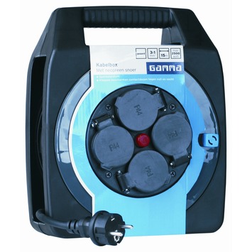 Met deze handige kabelbox van GAMMA rolt u uw verlengsnoer makkelijk en net op. Zodoende voorkomt u dat u struikelt over verlengsnoeren en laat u de werkplek opgeruimd achter. De zwarte box heeft een vaste kern met 4 waterdichte contactdozen met kleppen. Dit maakt het mogelijk om de kabelbox van 15 meter ook buiten in vochtige of vuile omstandigheden te gebruiken. De 15meter lange kabel heeft een dikte van 3x1mm2 en is gemaakt van neopreen. Daardoor is de kabel bestand tegen weersinvloeden en soepel op te rollen.