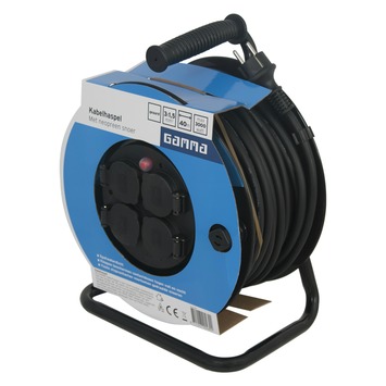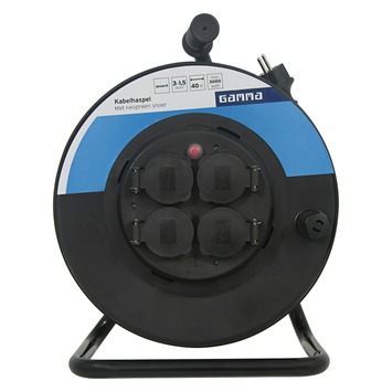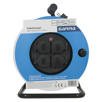 De GAMMA kabelhaspel is een meervoudige kabelhaspel met 4 IP44 contacten en een kabellengte van 40 meter. Dankzij de oververhittingsbeveiliging schakelt de stroom bij overbelasting uit. De haspel heeft vaste stopcontacten waarmee gedraaide snoeren worden voorkomen. Deze contacten zijn voorzien van kleppen die beschermen tegen vuil en vocht. Volledig afgerold kan er tot een maximaal vermogen van 3000 Watt worden aangesloten op de haspel. Opgerold kan er een vermogen van 1000 Watt worden aangesloten.