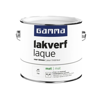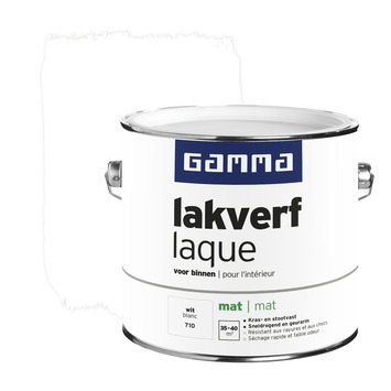 De GAMMA lakverf voor binnen in de kleur wit is ideaal voor het langdurig bescherming van deuren en kozijnen binnenshuis. Deze matte lak is op waterbasis. Het product onderscheid zich door een hoge dekkracht, lang glansbehoud, uitstekende vloeiing en een goede kantendekking. Het rendement van één blik van 2,5 liter is tussen de 35 en 40 m2. Op onbehandeld hout is het aan te bevelen om eerst GAMMA Grondverf voor binnen te gebruiken als voorbehandelingsproduct. Daarna volstaan 1 of 2 lagen lakverf voor binnen. De GAMMA lakverf voor binnen is kant en klaar beschikbaar in 13 populaire kleuren. Mocht u de kleur eerst thuis willen testen dan zijn al deze kleuren ook verkrijgbaar in handige 100 ml testerpotjes. De bestaande kleuren niet helemaal naar wens? Dan kan het product speciaal voor u in ieder gewenste kleur gemaakt worden in 750 ml en 100 ml op het GAMMA Kleurmengsysteem. Hier zijn geen extra kosten aan verbonden.