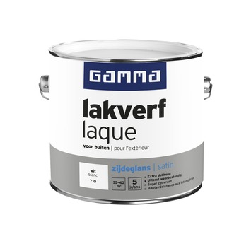 De GAMMA lakverf voor buiten in de kleur wit is ideaal voor het langdurig bescherming van deuren en kozijnen buitenshuis. Deze zijdeglanzende lak is op terpentinebasis. Het product onderscheid zich door een hoge dekkracht, lang glansbehoud, uitstekende vloeiing en een goede kantendekking. Het rendement van één blik van 2,5 liter is tussen de 20 en 25 M2. Op onbehandeld hout is het aan te bevelen om eerst GAMMA Grondverf voor buiten te gebruiken als voorbehandelingsproduct. Daarna volstaan 1 of 2 lagen lakverf voor buiten. De GAMMA lakverf voor buiten is kant en klaar beschikbaar in 13 populaire kleuren. Mocht u de kleur eerst thuis willen teste? Dan zijn al deze kleuren ook verkrijgbaar in handige 100 ml testerpotjes. De bestaande kleuren niet helemaal naar wens? Dan kan het product speciaal voor u in ieder gewenste kleur gemaakt worden in 750 ml op het GAMMA Kleurmengsysteem. Hier zijn geen extra kosten aan verbonden.