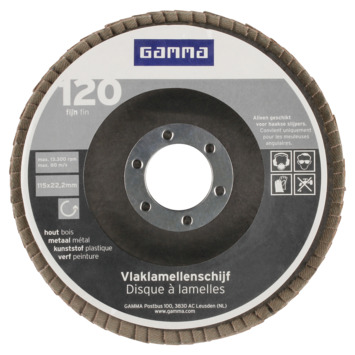 De Gamma vlaklamellenschijf met diameter 115mm is uitermate geschikt voor het bewerken/ slijpen van hout, metaal, kunststof en verf. De vlaklamellenschijf heeft een korrelgrootte van K120 (fijn) en is geschikt voor een haakse slijper.