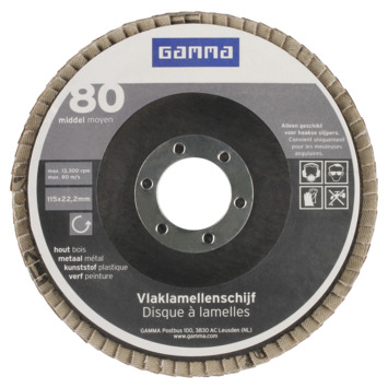 De Gamma vlaklamellenschijf met diameter 115mm is uitermate geschikt voor het bewerken/ slijpen van hout, metaal, kunststof en verf. De vlaklamellenschijf heeft een korrelgrootte van K80 (middel) en is geschikt voor een haakse slijper.