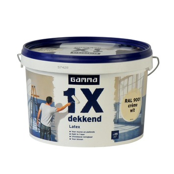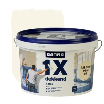 GAMMA latex 1x dekkend RAL 9001 crème wit mat 2,5 liter is een uitstekend dekkende matte muurverf. Afhankelijk van de kwaliteit van de ondergrond dekt deze verf in één laag. Ook de huidige kleur van de ondergrond heeft invloed of de verf in 1 laag dekt. De verf is geschikt voor het schilderen van alle droge vertrekken binnenshuis en is reinigbaar. Eén emmer van 2,5 liter volstaat voor het schilderen van een oppervlakte van 25 m2. De muurverf kan worden aangebracht met een kwast en vachtroller en is verkrijgbaar in verschillende wittinten.