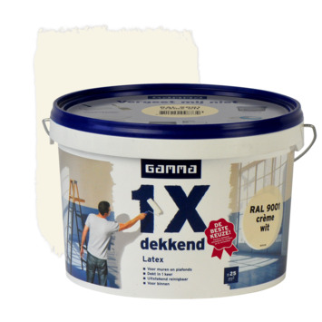 GAMMA latex 1x dekkend RAL 9001 crème wit mat 2,5 liter is een uitstekend dekkende matte muurverf. Afhankelijk van de kwaliteit van de ondergrond dekt deze verf in één laag. Ook de huidige kleur van de ondergrond heeft invloed of de verf in 1 laag dekt. De verf is geschikt voor het schilderen van alle droge vertrekken binnenshuis en is reinigbaar. Eén emmer van 2,5 liter volstaat voor het schilderen van een oppervlakte van 25 m2. De muurverf kan worden aangebracht met een kwast en vachtroller en is verkrijgbaar in verschillende wittinten.