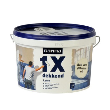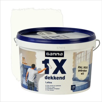 GAMMA latex 1x dekkend RAL 9010 gebroken wit mat 2,5 liter is een uitstekend dekkende matte muurverf. Afhankelijk van de kwaliteit van de ondergrond dekt deze verf in één laag. Ook de huidige kleur van de ondergrond heeft invloed of de verf in 1 laag dekt. De verf is geschikt voor het schilderen van alle droge vertrekken binnenshuis en is reinigbaar. Eén emmer van 2,5 liter volstaat voor het schilderen van een oppervlakte van 25 m2. De muurverf kan worden aangebracht met een kwast en vachtroller en is verkrijgbaar in verschillende wittinten.
