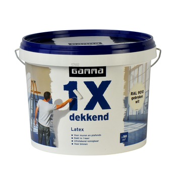 GAMMA latex 1x dekkend RAL 9010 gebroken wit mat 5 liter is een uitstekend dekkende matte muurverf. Afhankelijk van de kwaliteit van de ondergrond dekt deze verf in één laag. Ook de huidige kleur van de ondergrond heeft invloed of de verf in 1 laag dekt. De verf is geschikt voor het schilderen van alle droge vertrekken binnenshuis en is reinigbaar. Eén emmer van 5 liter volstaat voor het schilderen van een oppervlakte van 50 m2. De muurverf kan worden aangebracht met een kwast en vachtroller en is verkrijgbaar in verschillende wittinten.