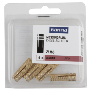De GAMMA Messingplug Ø 8mm, verpakt per 4 stuks, is geschikt voor montage in materialen als beton, kanaalplaat, volle baksteen en volle kalksteen. De spreidplug heeft een kleine verankeringsdiepte en is daardoor eenvoudig en snel te monteren. In combinatie met een metaalschroef M6 zorgt u voor een stevige bevestiging van voorwerpen, zoals spiegels en schilderijen. De messing plug is 24mm lang en heeft een boordiameter van 8mm. U koopt de M6-plug messing van GAMMA per verpakking met pluggen.