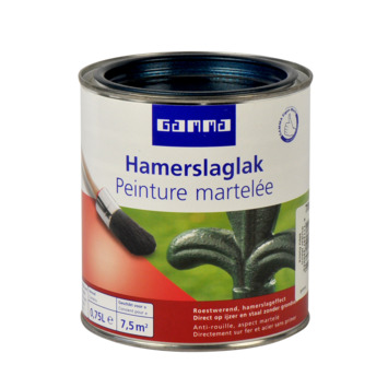 GAMMA metaallak hamerslag 250ml donkerblauw is een roestwerende metaallak met hamerslageffect en kan direct op metaal of hout worden aangebracht. Het is een antiroestmiddel, grondverf en lak in één. De lak is waterafstotend, kras- en stootvast, lood- en chroomaatvrij en heeft een uitstekende hechting. Deze GAMMA metaallak geeft uw hekwerk, meubels en speelgoed een langdurige bescherming en kan zowel binnen als buiten gebruikt worden. GAMMA metaallak hamerslag is in diverse kleuren leverbaar. Eén blik van 250 ml volstaat voor het schilderen van een oppervlakte van 3 m2.
