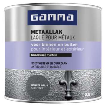 GAMMA metaallak is een roestwerende metaallak met hamerslageffect op terpentinebasis. Kan direct op de ondergrond worden aangebracht, zonder deze eerst voor te behandelen met een grondverf. Geschikt voor het schilderen van metalen hekwerken en meubels, maar kan ook op hout worden toegepast. Binnen en buiten te gebruiken.