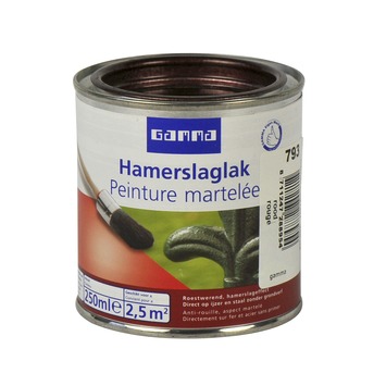 GAMMA metaallak rood koper hamerslag 250 ml is een roestwerende metaallak met hamerslageffect en kan direct op metaal of hout worden aangebracht. Het is een antiroestmiddel, grondverf en lak in één. De lak is waterafstotend, kras- en stootvast, lood- en chroomaatvrij en heeft een uitstekende hechting. Deze GAMMA metaallak geeft uw hekwerk, meubels en speelgoed een langdurige bescherming en kan zowel binnen als buiten gebruikt worden. GAMMA metaallak hamerslag is in diverse kleuren leverbaar. Eén blik van 250 ml volstaat voor het schilderen van een oppervlakte van 3 m2.