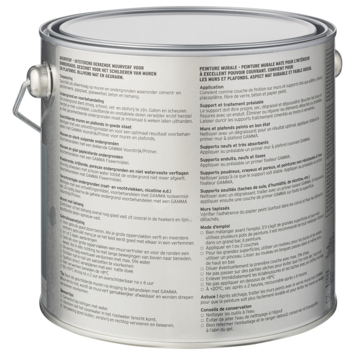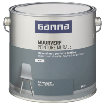 De GAMMA muurverf voor binnenshuis is geschikt voor het schilderen van muren en plafonds. De GAMMA muurverf diepblauw mat 2,5 L is een geur arme watergedragen muurverf. Het blik heeft een inhoud van 2,5 liter, dit is voldoende voor een oppervlakte van ongeveer 20 m². Twee uur na het aanbrengen van de verf is deze reeds stofdroog, na 6 uur kan je de volgende laag aanbrengen. De beste temperatuur om met deze verf te werken is tussen de 8 en 25°C.