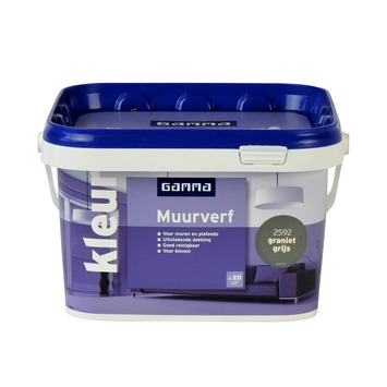 GAMMA muurverf graniet grijs 2,5 liter heeft een matte uitstraling en kan worden toegepast in droge ruimtes binnenshuis. De verf heeft een goede dekking en is afwasbaar. Eén emmer van 2,5 liter volstaat voor het schilderen van een oppervlakte van 20 m2. De muurverf kan worden aangebracht met een vachtroller. Naast de standaard beschikbare kleuren is deze verf in meer dan 30.000 verschillende kleuren te verkrijgen bij onze verfmengbalie in de GAMMA bouwmarkt. Met GAMMA muurverf geeft u trendy accenten aan uw woonkamer, hal of slaapkamer.