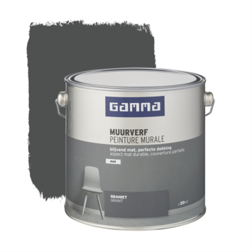 De GAMMA muurverf voor binnenshuis is geschikt voor het schilderen van muren en plafonds. De GAMMA muurverf graniet mat 2,5 L is een geur arme watergedragen muurverf. Het blik heeft een inhoud van 2,5 liter, dit is voldoende voor een oppervlakte van ongeveer 20 m². Twee uur na het aanbrengen van de verf is deze reeds stofdroog, na 6 uur kan je de volgende laag aanbrengen. De beste temperatuur om met deze verf te werken is tussen de 8 en 25°C.