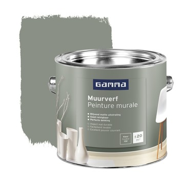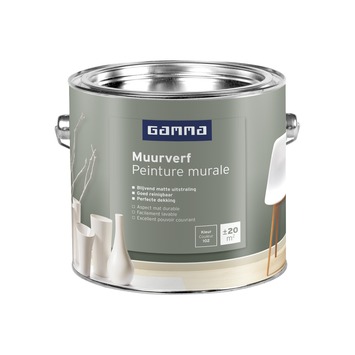 GAMMA muurverf nr. 102 2,5 liter heeft een matte uitstraling en kan worden toegepast in droge ruimtes binnenshuis. De verf heeft een goede dekking en is afwasbaar. Eén emmer van 2,5 liter volstaat voor het schilderen van een oppervlakte van 20 m2. De muurverf kan worden aangebracht met een vachtroller. Met GAMMA muurverf geeft u trendy accenten aan uw woonkamer, hal of slaapkamer. Niet helemaal zeker over de kleur? Koop een GAMMA Kleurtester en probeer het thuis!