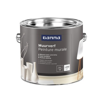 GAMMA muurverf nr. 108 2,5 liter heeft een matte uitstraling en kan worden toegepast in droge ruimtes binnenshuis. De verf heeft een goede dekking en is afwasbaar. Eén emmer van 2,5 liter volstaat voor het schilderen van een oppervlakte van 20 m2. De muurverf kan worden aangebracht met een vachtroller. Met GAMMA muurverf geeft u trendy accenten aan uw woonkamer, hal of slaapkamer. Niet helemaal zeker over de kleur? Koop een GAMMA Kleurtester en probeer het thuis!