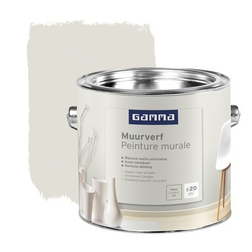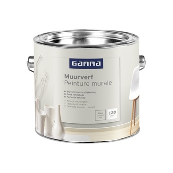 GAMMA muurverf nr. 111 2,5 liter heeft een matte uitstraling en kan worden toegepast in droge ruimtes binnenshuis. De verf heeft een goede dekking en is afwasbaar. Eén emmer van 2,5 liter volstaat voor het schilderen van een oppervlakte van 20 m2. De muurverf kan worden aangebracht met een vachtroller. Met GAMMA muurverf geeft u trendy accenten aan uw woonkamer, hal of slaapkamer. Niet helemaal zeker over de kleur? Koop een GAMMA Kleurtester en probeer het thuis!