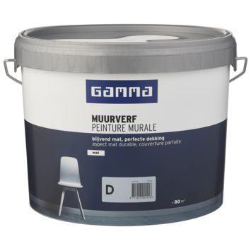 De GAMMA muurverf mat 10 liter voor binnenshuis is geschikt voor het schilderen van muren en plafonds. De GAMMA muurverf is een watergedragen muurverf. Twee uur na het aanbrengen van de verf is deze reeds stofdroog, na 6 uur kan je de volgende laag aanbrengen. Met zijn uitstekende dekking is de verf zeer geschikt als afwerklaag op verschillende ondergronden, waaronder cement- en pleisterwerk, gipsplaat, glasweefsel, beton en behang.
