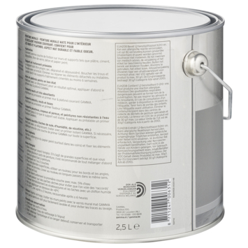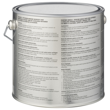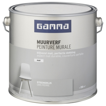 De GAMMA muurverf voor binnenshuis is geschikt voor het schilderen van muren en plafonds. De GAMMA muurverf steengrijs mat 2,5 L is een geur arme watergedragen muurverf. Het blik heeft een inhoud van 2,5 liter, dit is voldoende voor een oppervlakte van ongeveer 20 m². Twee uur na het aanbrengen van de verf is deze reeds stofdroog, na 6 uur kan je de volgende laag aanbrengen. De beste temperatuur om met deze verf te werken is tussen de 8 en 25°C.