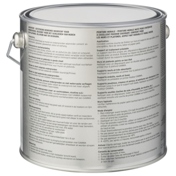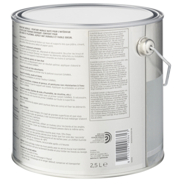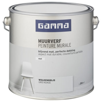 De GAMMA muurverf voor binnenshuis is geschikt voor het schilderen van muren en plafonds. De GAMMA muurverf wolkengrijs mat 2,5 L is een geur arme watergedragen muurverf. Het blik heeft een inhoud van 2,5 liter, dit is voldoende voor een oppervlakte van ongeveer 20 m². Twee uur na het aanbrengen van de verf is deze reeds stofdroog, na 6 uur kan je de volgende laag aanbrengen. De beste temperatuur om met deze verf te werken is tussen de 8 en 25°C.