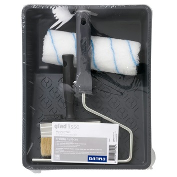 De GAMMA muurverfset (4-delig) is bedoeld voor het aanbrengen van muurverf op zowel gladde als ruwe ondergronden. In de set zit een muurverfroller van 18 centimeter met een lange vacht, een bijpassende beugel, een blokkwast en een extra grote verfbak. Je gebruikt deze set voor verf op water- of terpentinebasis, zoals latex of andere soorten muurverf. De vachtroller is geschikt voor grote vlakken en zorgt voor een gelijkmatige verdeling van de verf. De blokkwast is handig voor de randen en hoeken waar je met de roller niet goed bij kunt. Alles wat je nodig hebt voor een complete schilderklus zit in deze set.