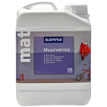 GAMMA muurvernis kleurloos mat 2,5 liter is een kleurloze, matte muurvernis. Dit product maakt geschilderde muren vuil- en vochtafstotend en optimaal afwasbaar waardoor glanzende plekken en strepen na boenen worden voorkomen. Donker geschilderde muren worden intenser van kleur en weerbaarder tegen witte vegen. Dit product is geschikt voor binnen en op waterbasis wat als voordeel heeft dat het snel droogt en geurarm is. Het rendement van 2,5 liter is ongeveer 45 m2 en kan worden aangebracht met een roller.