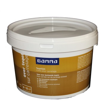 Gamma tegelijm pasta tegel over tegel wit 12 kilogram is een gebruiksklare lijmen voor het verlijmen van keramische wandtegels op verschillende ondergronden en specifiek voor tegel over tegel toepassing. Gamma tegellijm pasta tegel over tegel 12 kilogram is geschikt voor gebruik in vochtige ruimtes. Voor toepassing binnenshuis