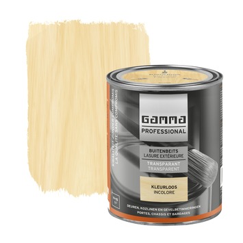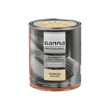 GAMMA Professional buitenbeits kleurloos hoogglans 750 ml is ideaal voor langdurige bescherming van hoogwaardig hout zoals buitendeuren, buitenkozijnen, daklijsten en gevelbetimmeringen. Door de toevoeging van siliconen en andere zeer hoogwaardige grondstoffen kan een duurzaamheid van 7 jaar worden gegarandeerd. Deze hoogglanzende beits is een oplosmiddel houdend product en beschikbaar in diverse populaire dekkende en transparante kleuren. Het product is weersbestendig, waterafstotend, UVtot bestendig en vochtregulerend. Het rendement van één blik van 750 ml is ongeveer 10 tot 14 m2. Op onbehandeld hout is het aan te bevelen om 3 dunne lagen aan te brengen, op hout in goede staat volstaan 2 lagen. Grondverf is niet nodig.