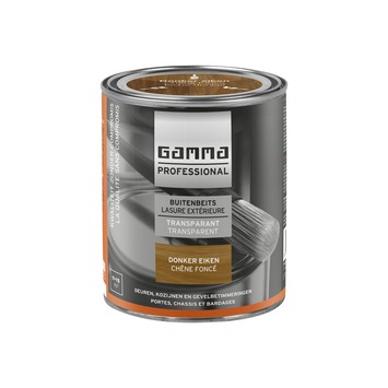 GAMMA Professional buitenbeits transparant donker eiken hoogglans 750 ml is ideaal voor langdurige bescherming van hoogwaardig hout zoals buitendeuren, buitenkozijnen, daklijsten en gevelbetimmeringen. Door de toevoeging van siliconen en andere zeer hoogwaardige grondstoffen kan een duurzaamheid van 7 jaar worden gegarandeerd. Deze hoogglanzende beits is een oplosmiddel houdend product en beschikbaar in diverse populaire dekkende en transparante kleuren. Het product is weersbestendig, waterafstotend, UVtot bestendig en vochtregulerend. Het rendement van één blik van 750 ml is ongeveer 10 tot 14 m2. Op onbehandeld hout is het aan te bevelen om 3 dunne lagen aan te brengen, op hout in goede staat volstaan 2 lagen. Grondverf is niet nodig.