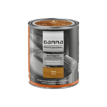 GAMMA Professional buitenbeits transparant teak hoogglans 750 ml is ideaal voor langdurige bescherming van hoogwaardig hout zoals buitendeuren, buitenkozijnen, daklijsten en gevelbetimmeringen. Door de toevoeging van siliconen en andere zeer hoogwaardige grondstoffen kan een duurzaamheid van 7 jaar worden gegarandeerd. Deze hoogglanzende beits is een oplosmiddel houdend product en beschikbaar in diverse populaire dekkende en transparante kleuren. Het product is weersbestendig, waterafstotend, UVtot bestendig en vochtregulerend. Het rendement van één blik van 750 ml is ongeveer 10 tot 14 m2. Op onbehandeld hout is het aan te bevelen om 3 dunne lagen aan te brengen, op hout in goede staat volstaan 2 lagen. Grondverf is niet nodig.