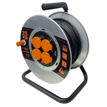 De haspel heeft vier geaarde stopcontacten met klepjes voor extra veiligheid. Zo sluit je meerdere apparaten tegelijk aan zonder risico op kortsluiting. De ingebouwde overspanningsbeveiliging voorkomt schade bij spanningspieken. De kabel is geschikt voor een voedingsspanning van 230 volt en levert tot 1000 watt vermogen als hij deels is uitgerold en tot 3000 watt als hij volledig is uitgerold. Rol de kabel altijd helemaal uit tijdens gebruik en sluit nooit meerdere haspels achter elkaar aan, zodat de warmte goed kan wegvloeien.