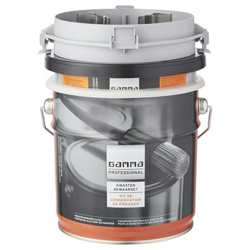 Geen harde kwasten meer dankzij GAMMA Professional kwasten bewaargel. Deze basisset is een innovatief systeem om 1 tot maximaal 6 kwasten gemakkelijk kort of (maanden-)lang te bewaren in kwasten bewaargel. Plaats de kwast met de haren in de gel en sluit de pot. Om de kwast weer in gebruik te nemen strijkt u de gel van de kwastharen af aan de rand van de afstrijkpot en veegt u de kwast nog even na met een doekje. Voor gebruik van alle soorten verf en kwasten met uitzondering van vochtuithardende en 2-componenten verf. Inclusief 1,5 liter milieuvriendelijke bewaargel, ring, deksel en 2 kwastenklemmen.