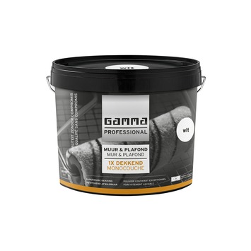 GAMMA Professional Muur & Plafond 1x dekkend wit 10 liter is een professionele topkwaliteit muurverf, die afhankelijk van de kwaliteit en kleur van de ondergrond in één laag dekkend is. De verf is geschikt voor het schilderen van alle droge vertrekken binnenshuis en is schrobvast. Eén emmer van 10 liter volstaat voor het schilderen van een oppervlakte van 100 m2. De muurverf kan worden aangebracht met een kwast en vachtroller. De muurverf is kant en klaar verkrijgbaar in wit, gebroken wit (RAL 9010) en crème wit (RAL 9001) en daarnaast in alle kleuren van het GAMMA kleurmengsysteem.