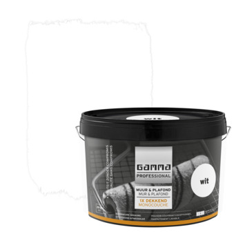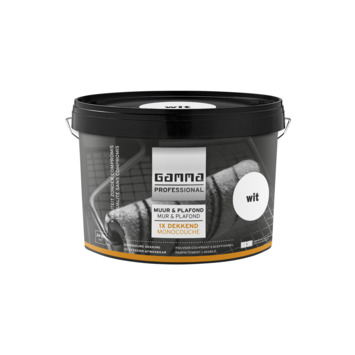 GAMMA Professional Muur & Plafond 1x dekkend wit 2,5 liter is een professionele topkwaliteit muurverf, die afhankelijk van de kwaliteit en kleur van de ondergrond in één laag dekkend is. De verf is geschikt voor het schilderen van alle droge vertrekken binnenshuis. Eén emmer van 2.5 liter volstaat voor het schilderen van een oppervlakte van 25 m2. De muurverf kan worden aangebracht met een kwast en vachtroller. De muurverf is kant en klaar verkrijgbaar in wit, gebroken wit (RAL 9010) en crème wit (RAL 9001) en daarnaast in alle kleuren van het GAMMA kleurmengsysteem.