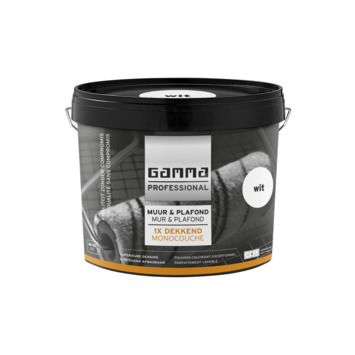 GAMMA Professional Muur & Plafond 1x dekkend wit 5 liter is een professionele topkwaliteit muurverf, die afhankelijk van de kwaliteit en kleur van de ondergrond in één laag dekkend is. De verf is geschikt voor het schilderen van alle droge vertrekken binnenshuis en is schrobvast. Eén emmer van 5 liter volstaat voor het schilderen van een oppervlakte van 50 m2. De muurverf kan worden aangebracht met een kwast en vachtroller. De muurverf is kant en klaar verkrijgbaar in wit, gebroken wit (RAL 9010) en crème wit (RAL 9001) en daarnaast in alle kleuren van het GAMMA kleurmengsysteem.